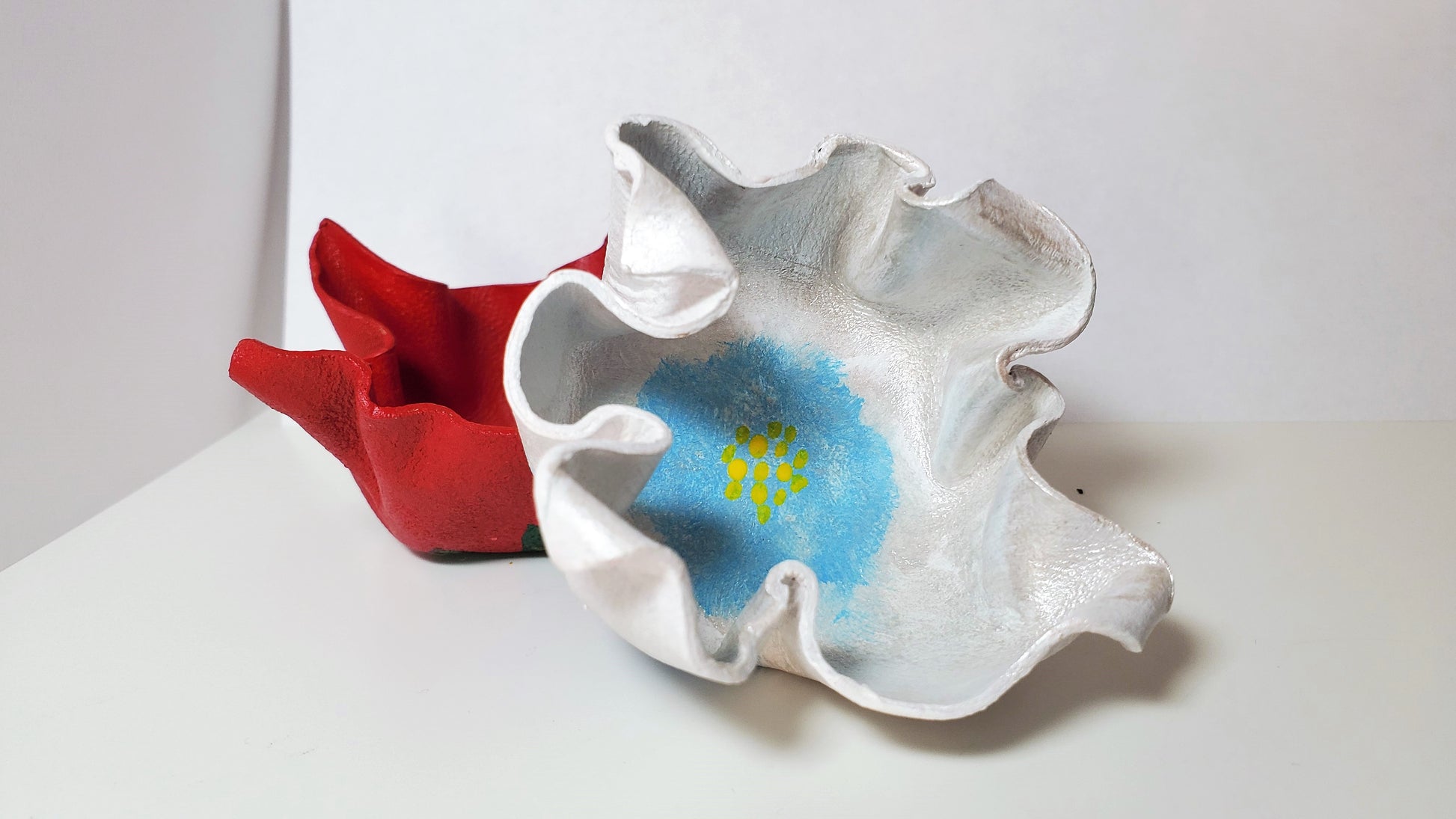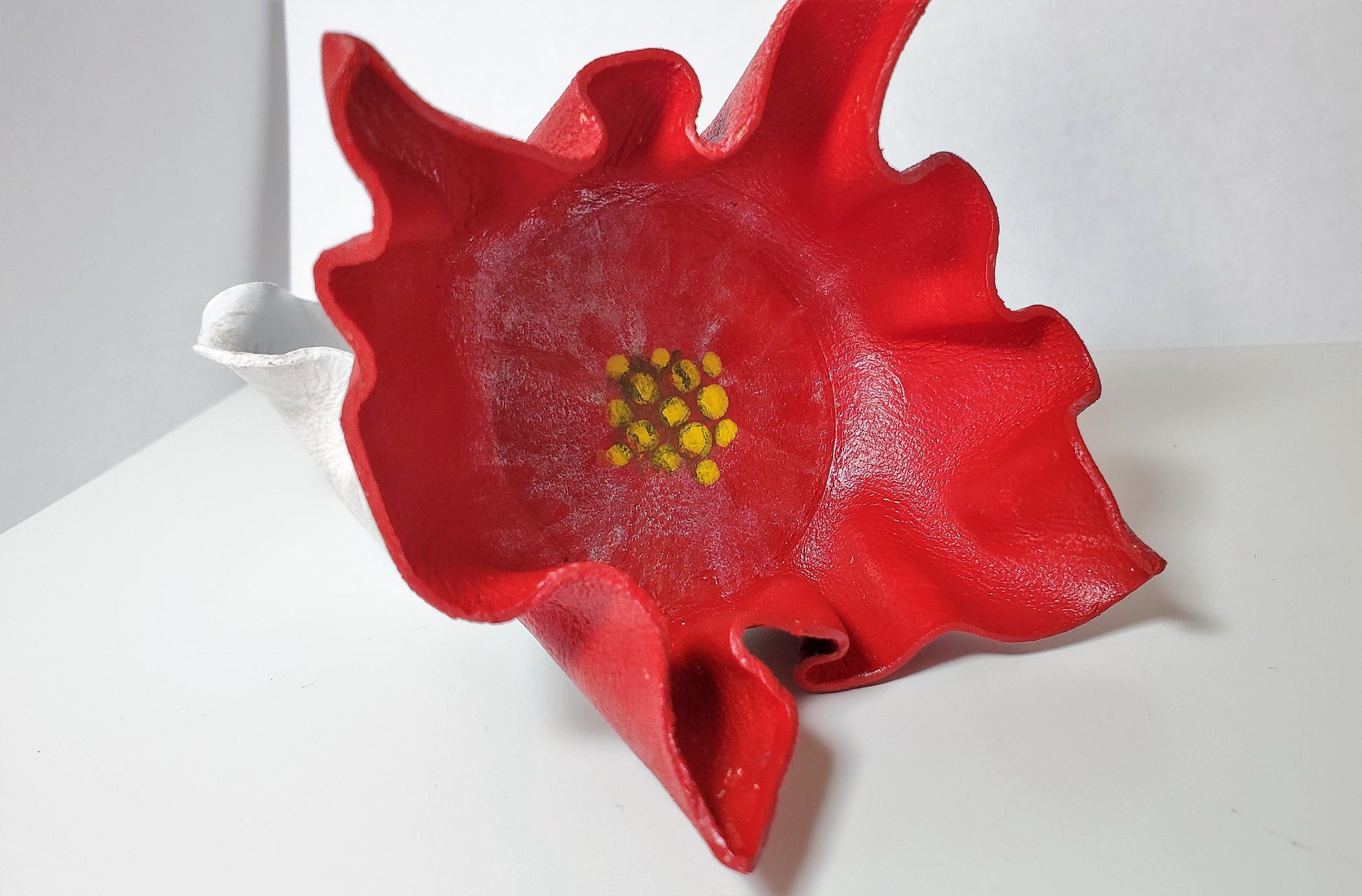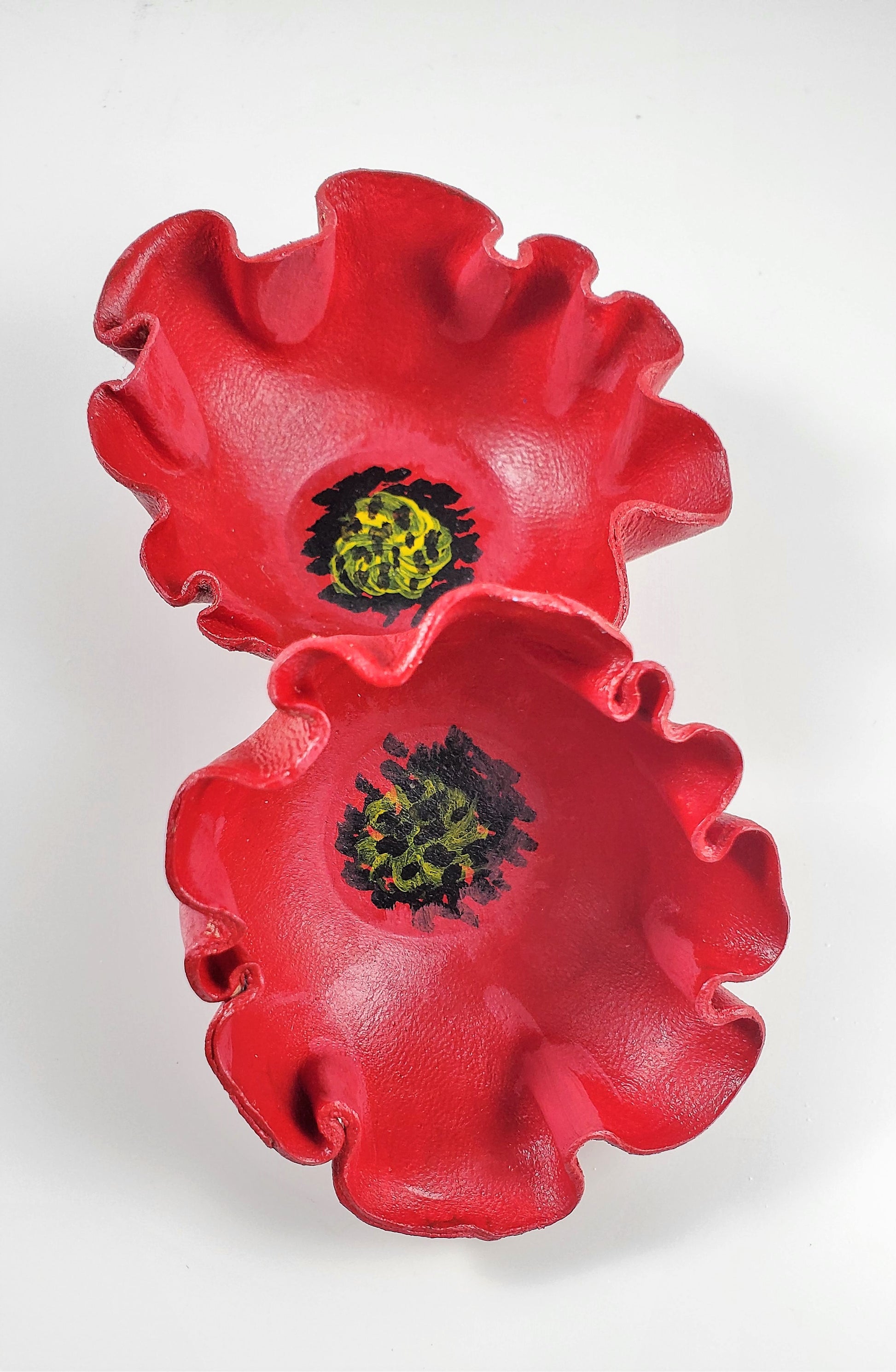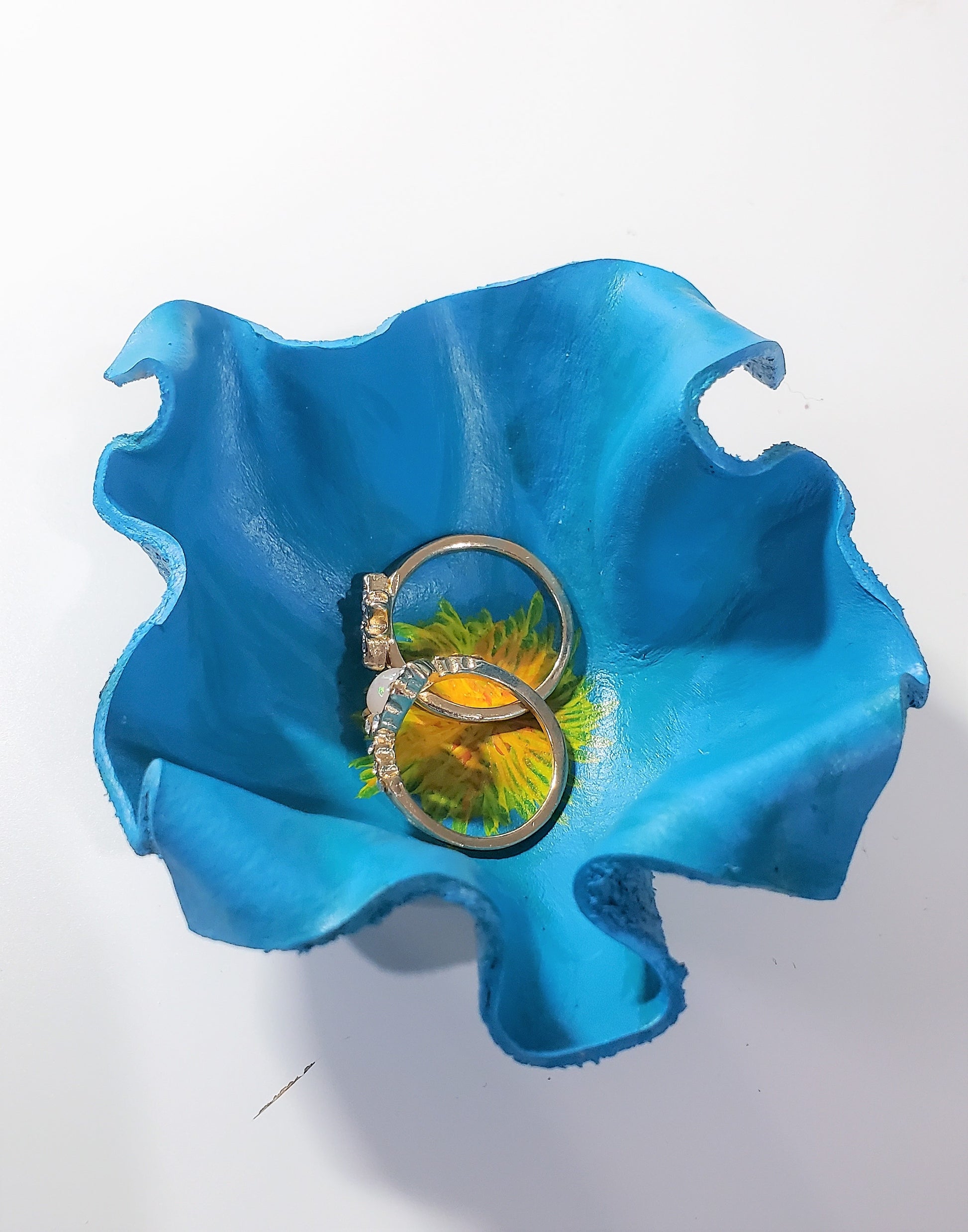 These hand painted leather dishes are made from veg-tanned cow leather, shaped by hand and finished in vibrant color. Extremely lightweight yet durable, these stunning little pieces are sure to make a beautiful addition to your home. They won't break if knocked from a counter, so they are perfect for homes with cats or small children. They also make for great tealight holders, but it is recommended that you use battery-operated candles. If using real flame, never leave unattended.