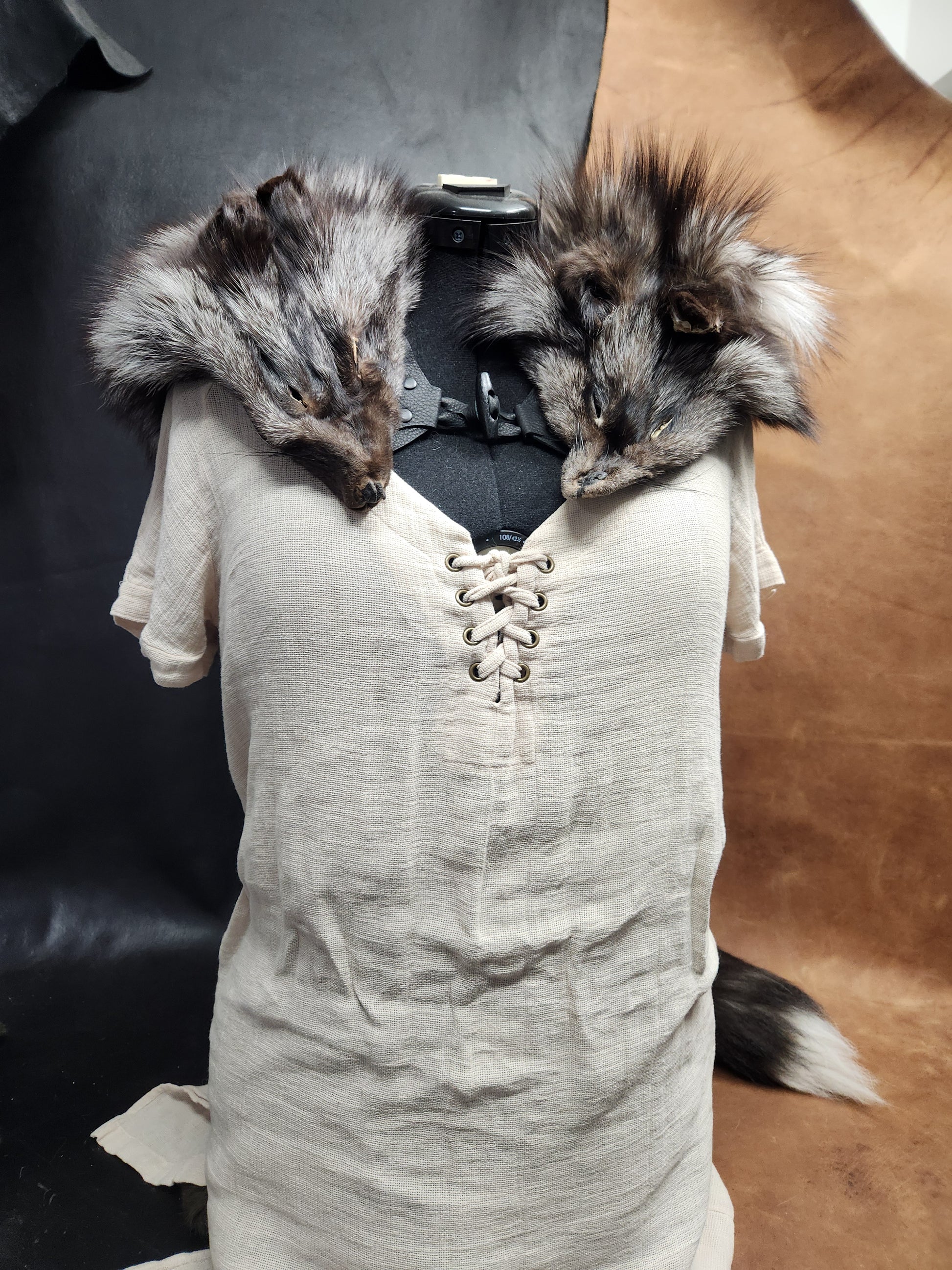 This beautiful mantle is made from two full silver fox pelts, finished on a soft black deerskin with a handmade leather toggle. A deerskin cord attaches just under the faces and ties around your back to keep the mantle from sliding back.