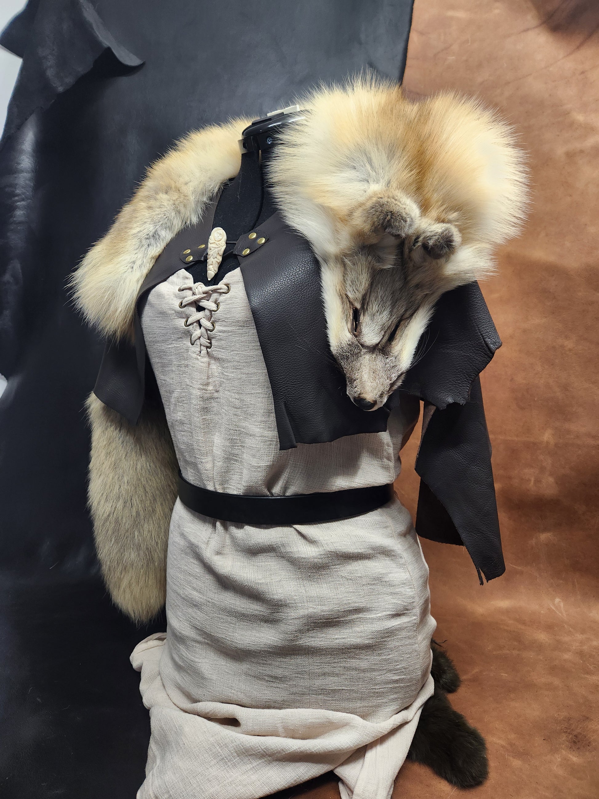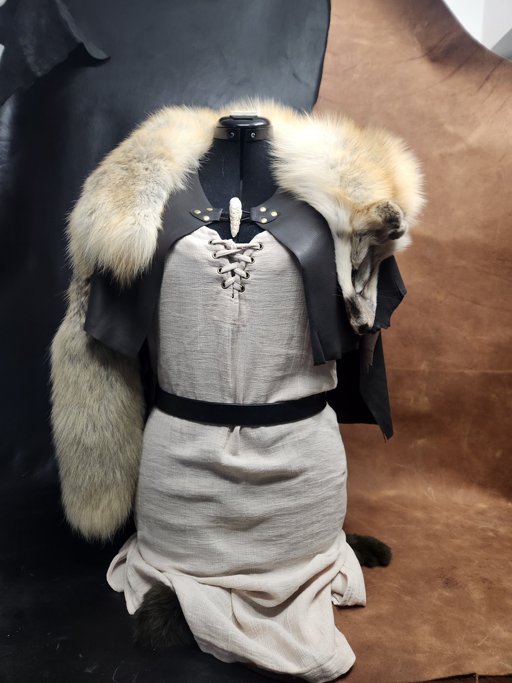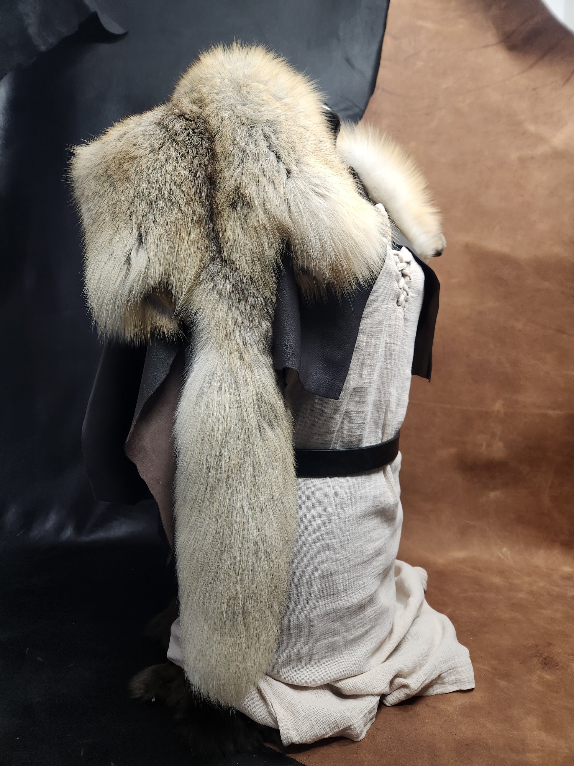 This beautiful mantle is made from one premium Golden Island fox pelt, finished on a soft elkskin with beautiful carved bone toggle from Saga of Antler and Bone. Elegant and warm, it is perfect to pair with your next festival outfit.