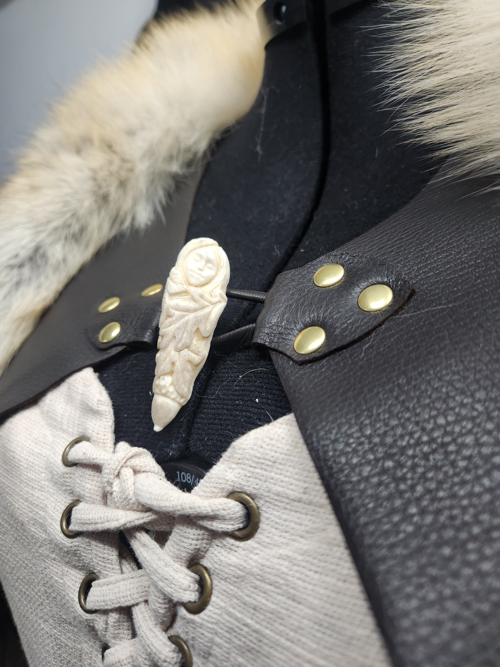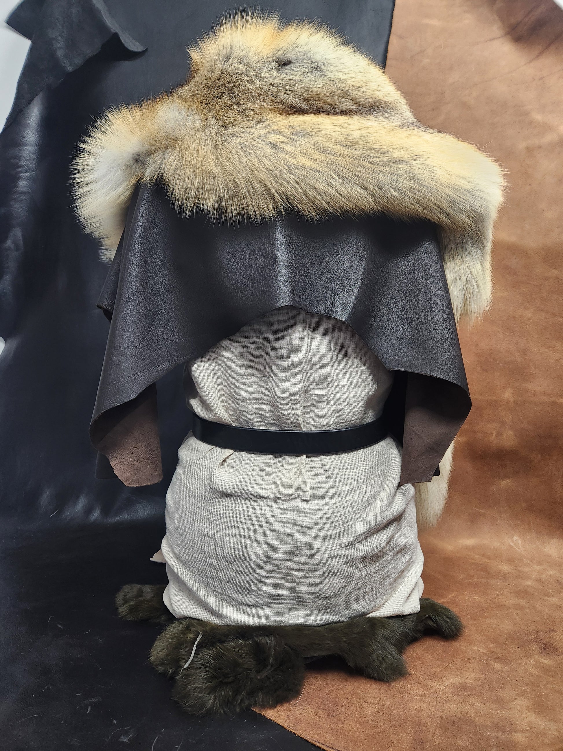 Golden Island Fox Fur Mantle with Dark Brown Elk Skin Leather and Carved Bone Toggle