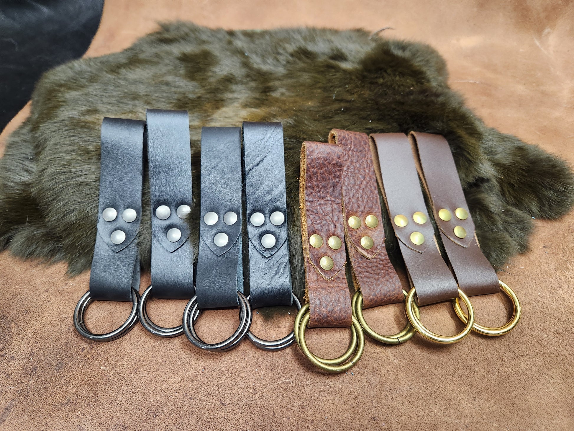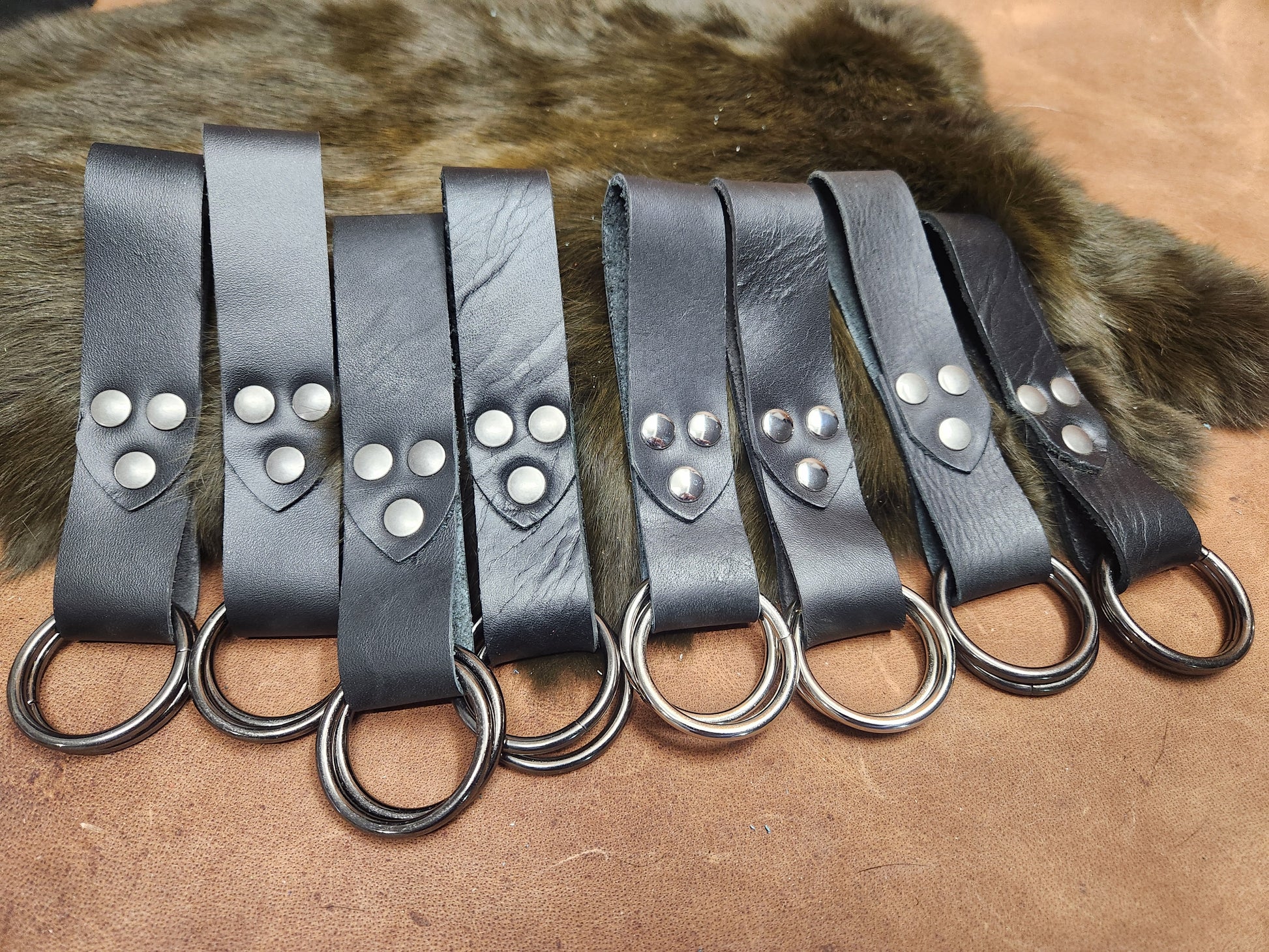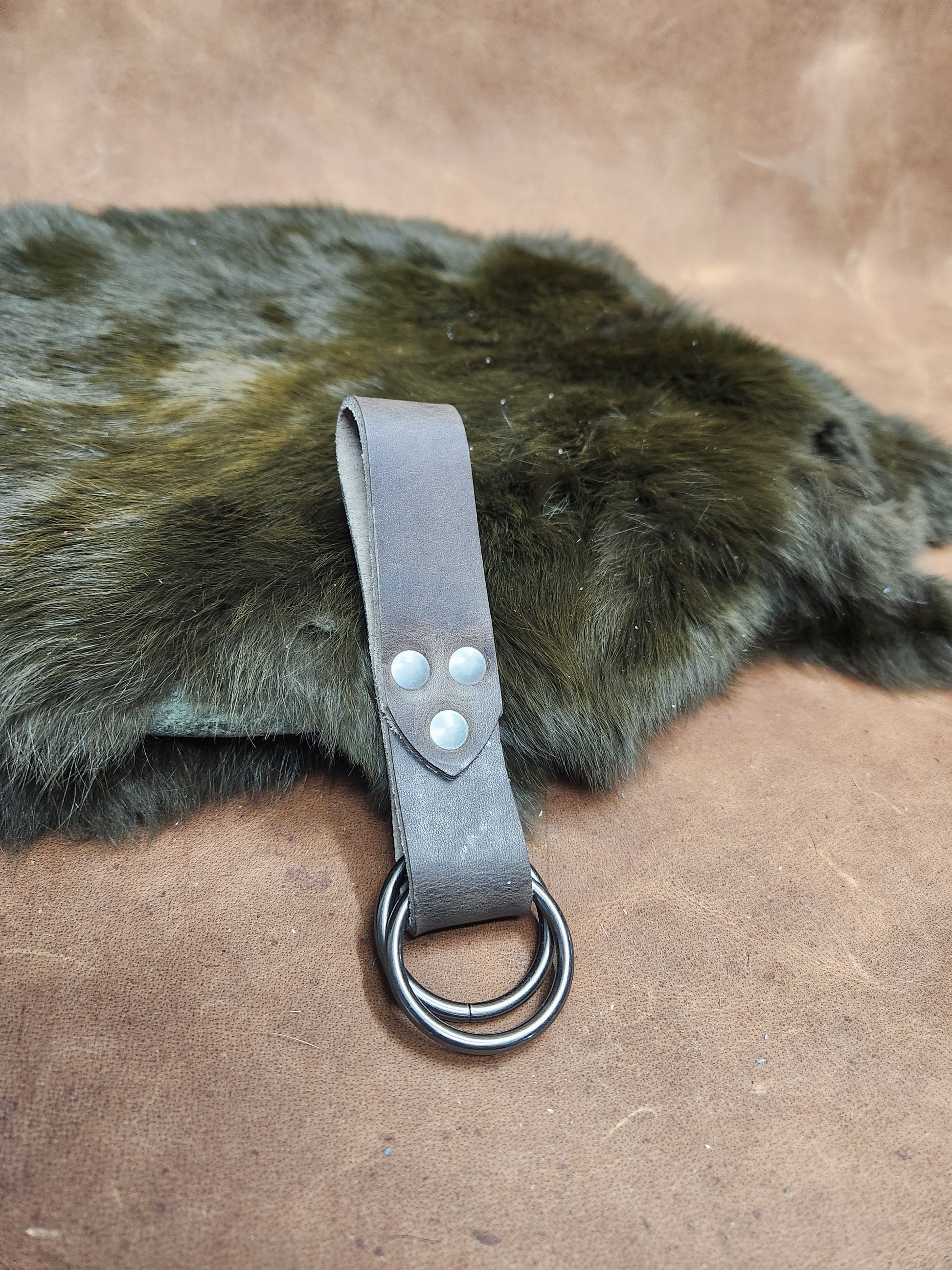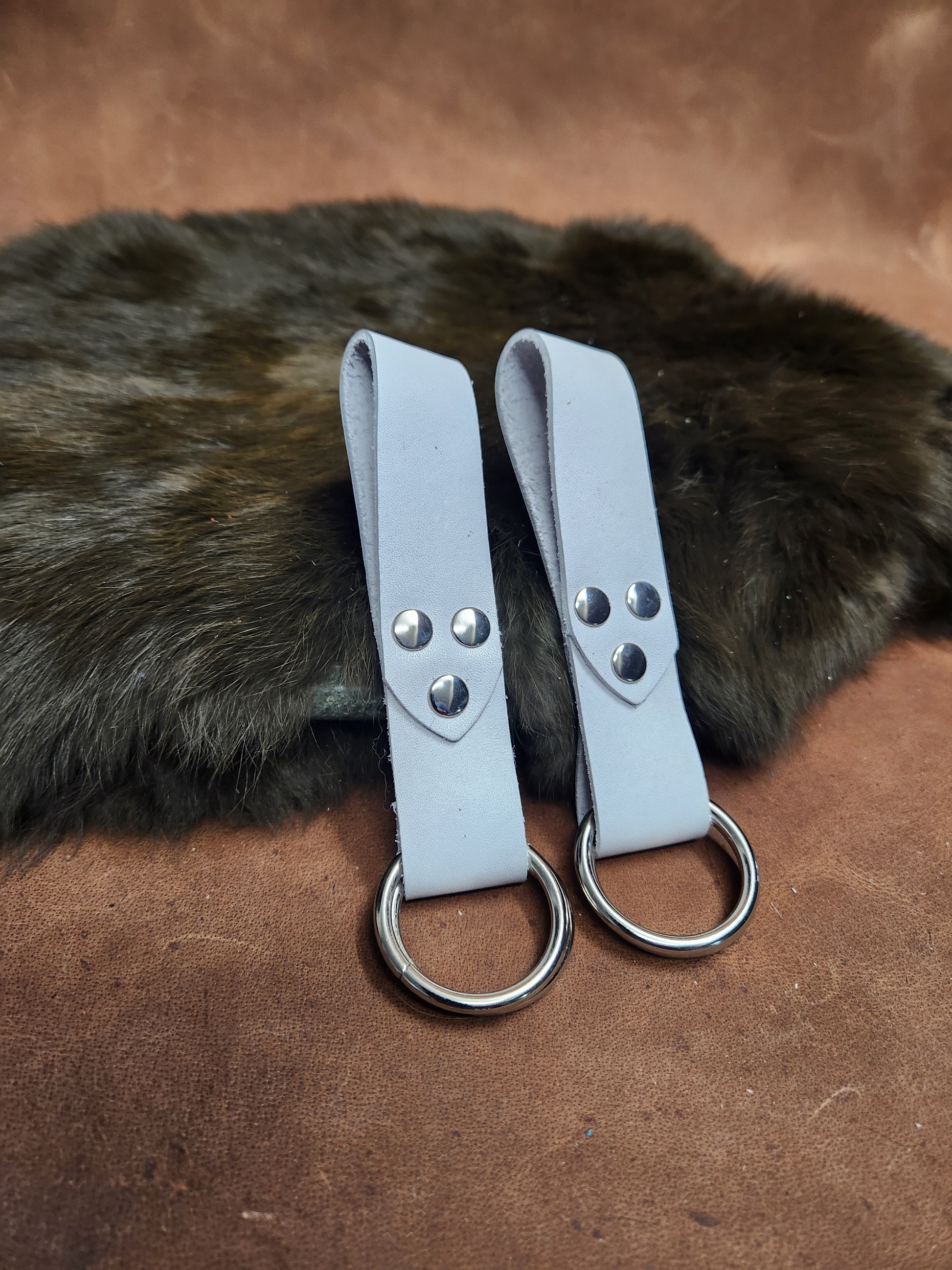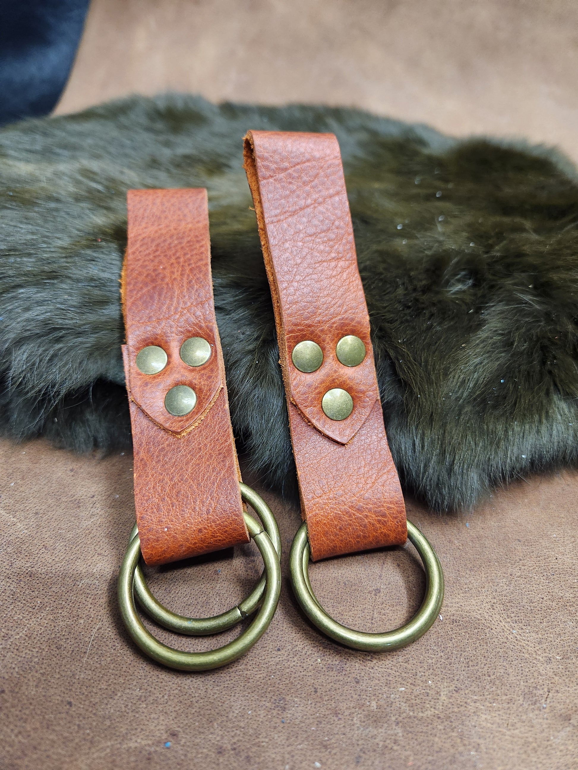Simple leather skirt hikes! Two O rings will help support your skirts with a loop to attach to your belt or scarf to hold it up. The rings are 1.25" big, and the belt loop can support a belt up to 2" wide.