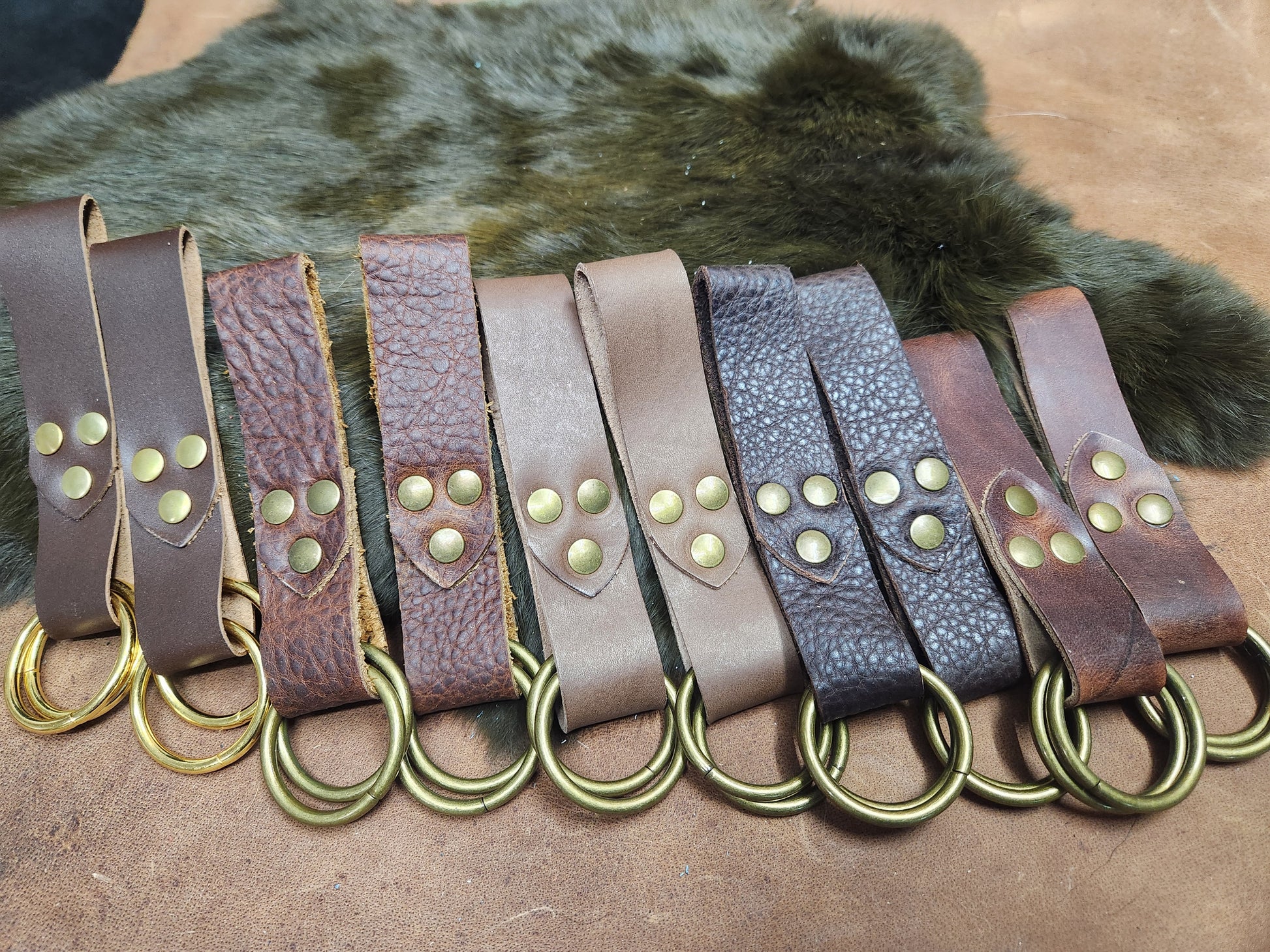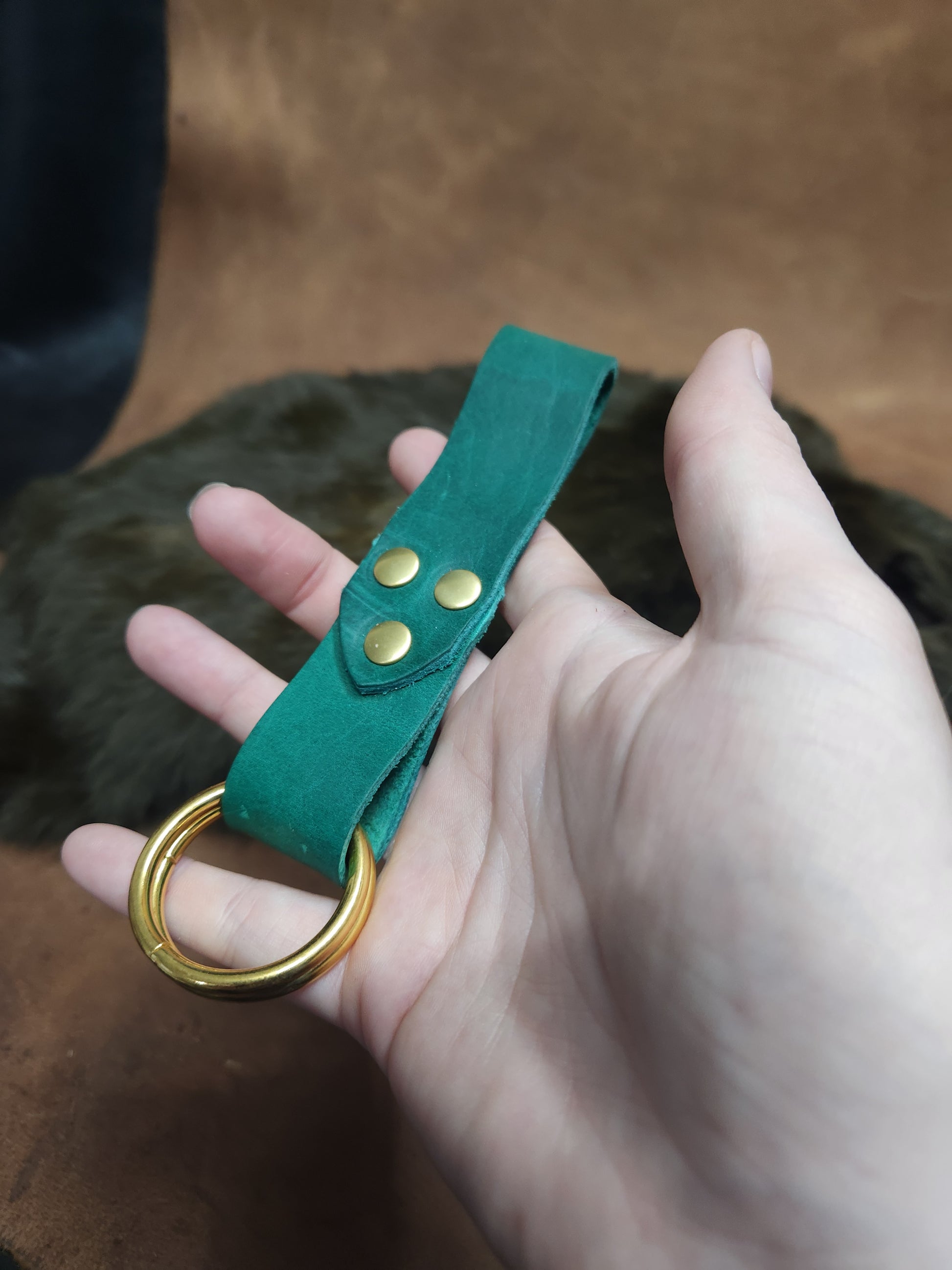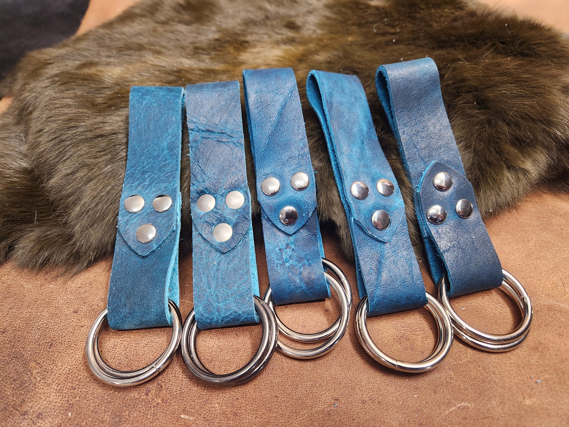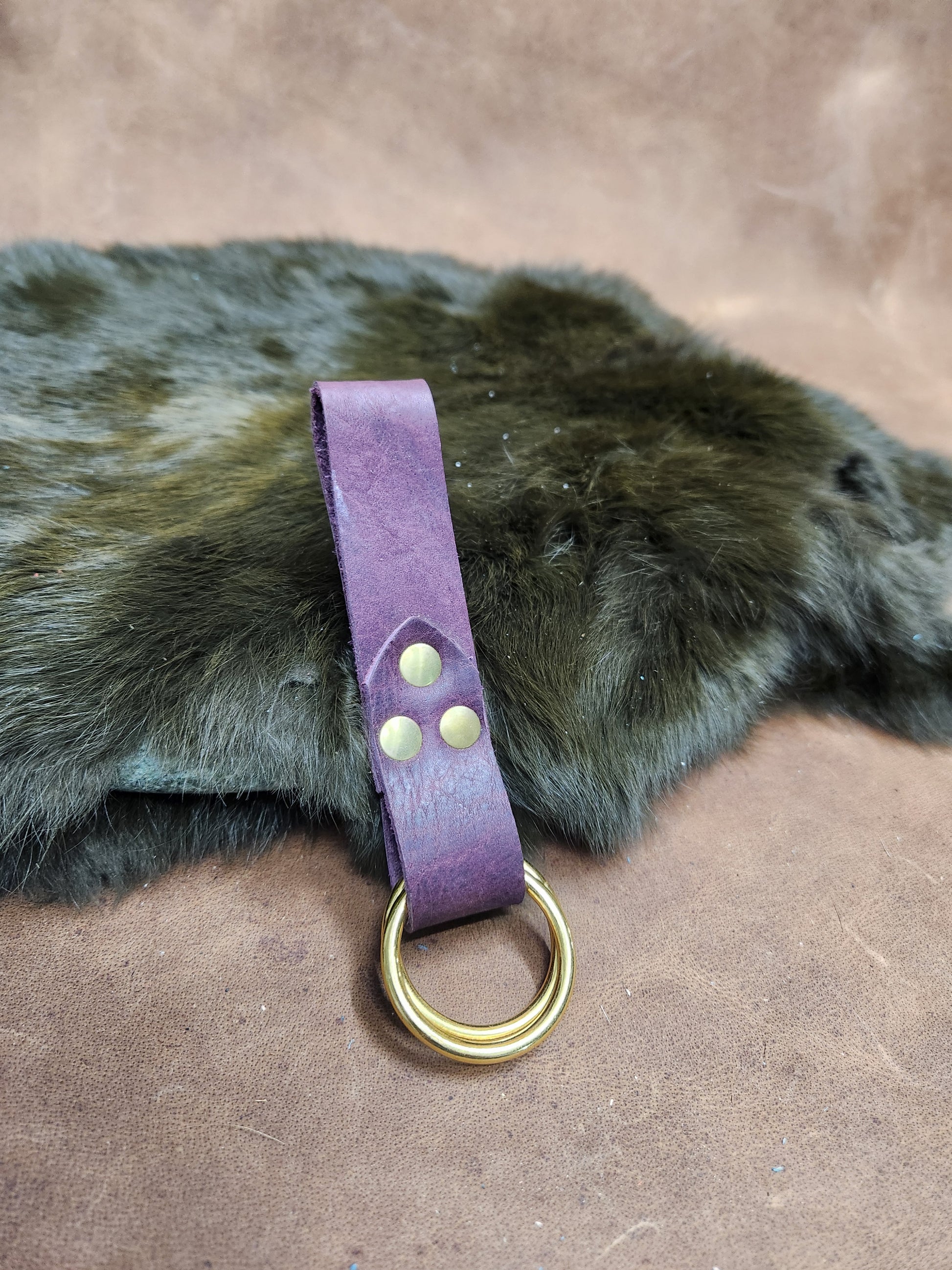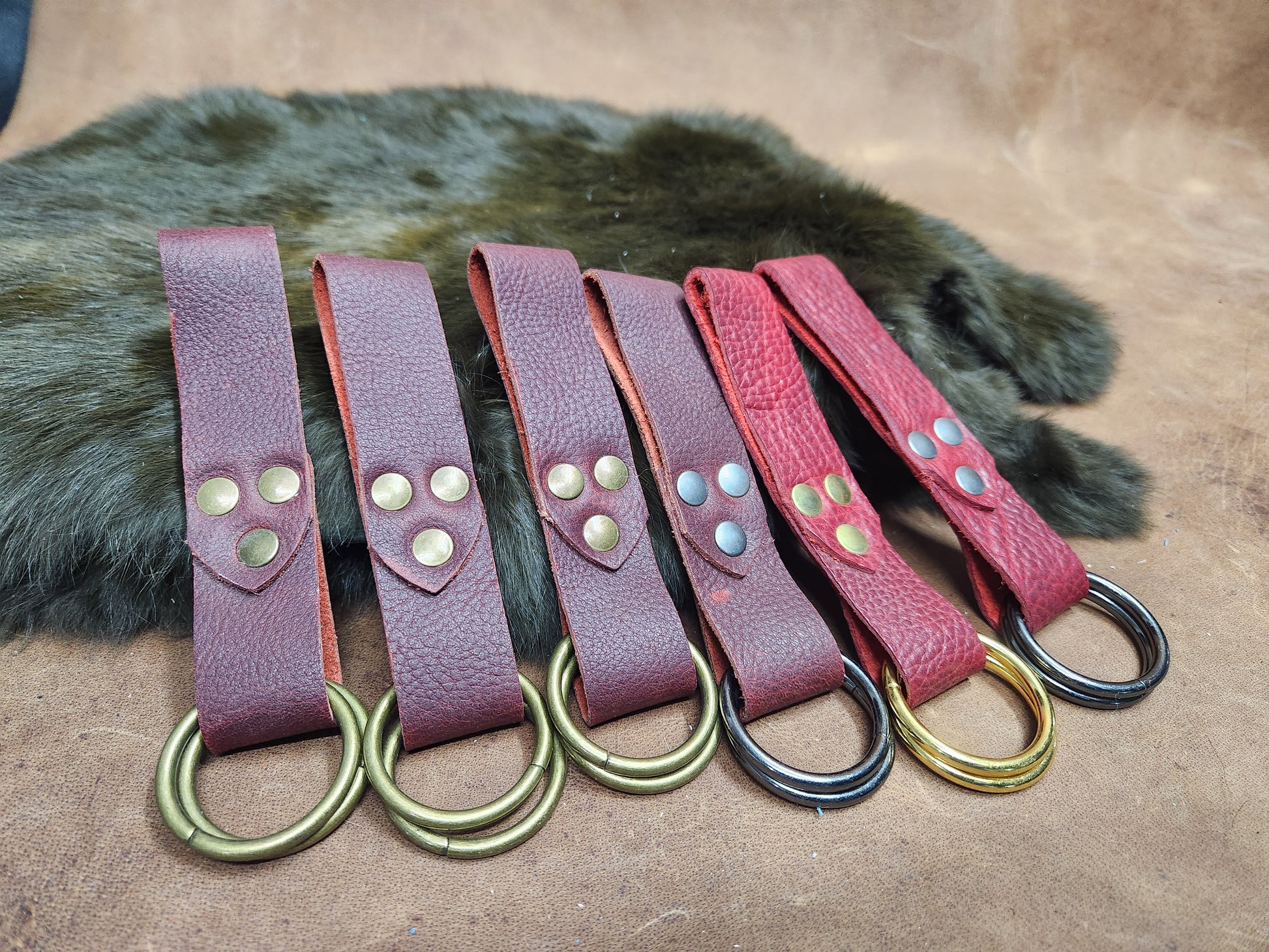 Simple leather skirt hikes! Two O rings will help support your skirts with a loop to attach to your belt or scarf to hold it up. The rings are 1.25" big, and the belt loop can support a belt up to 2" wide.