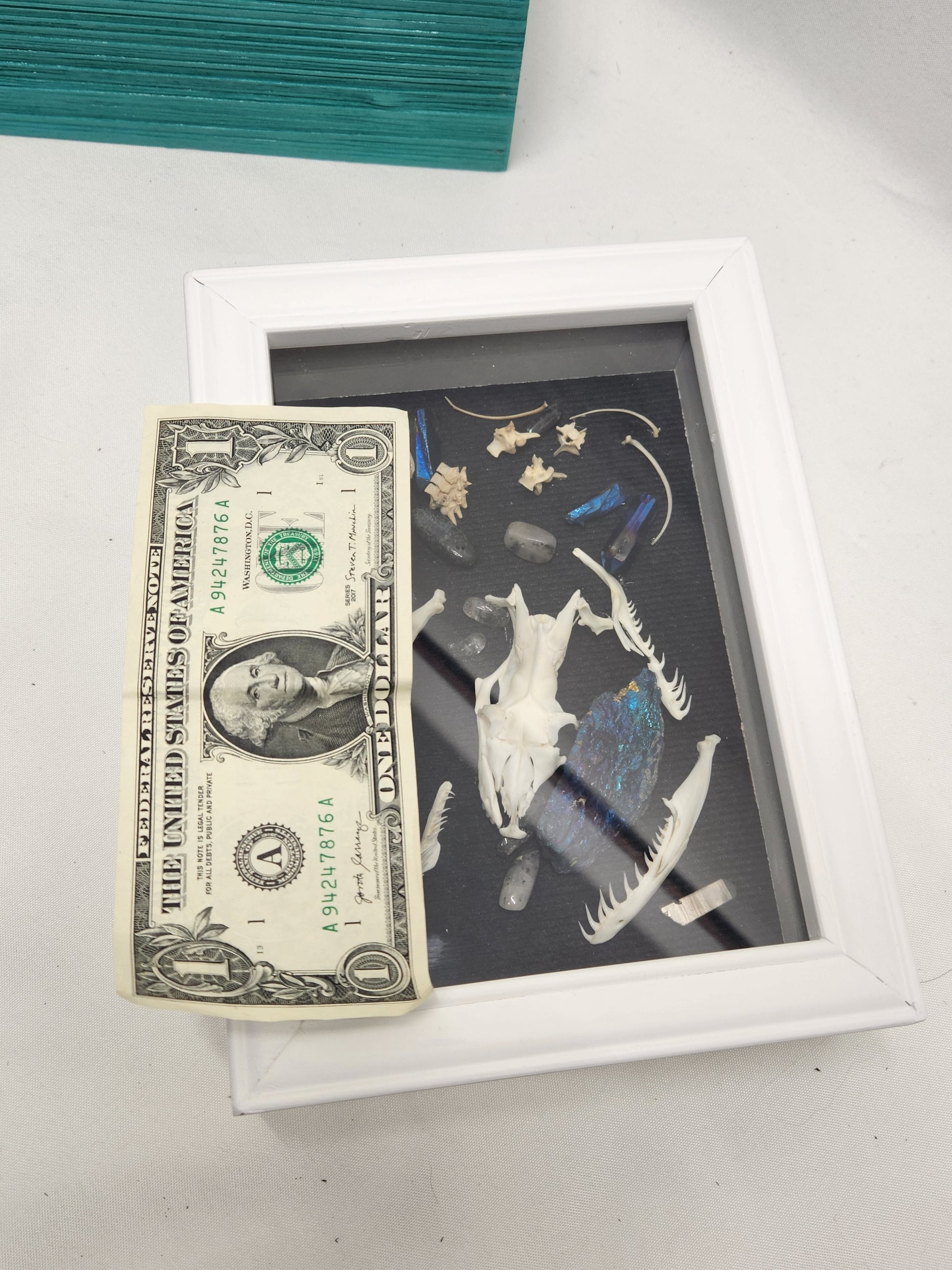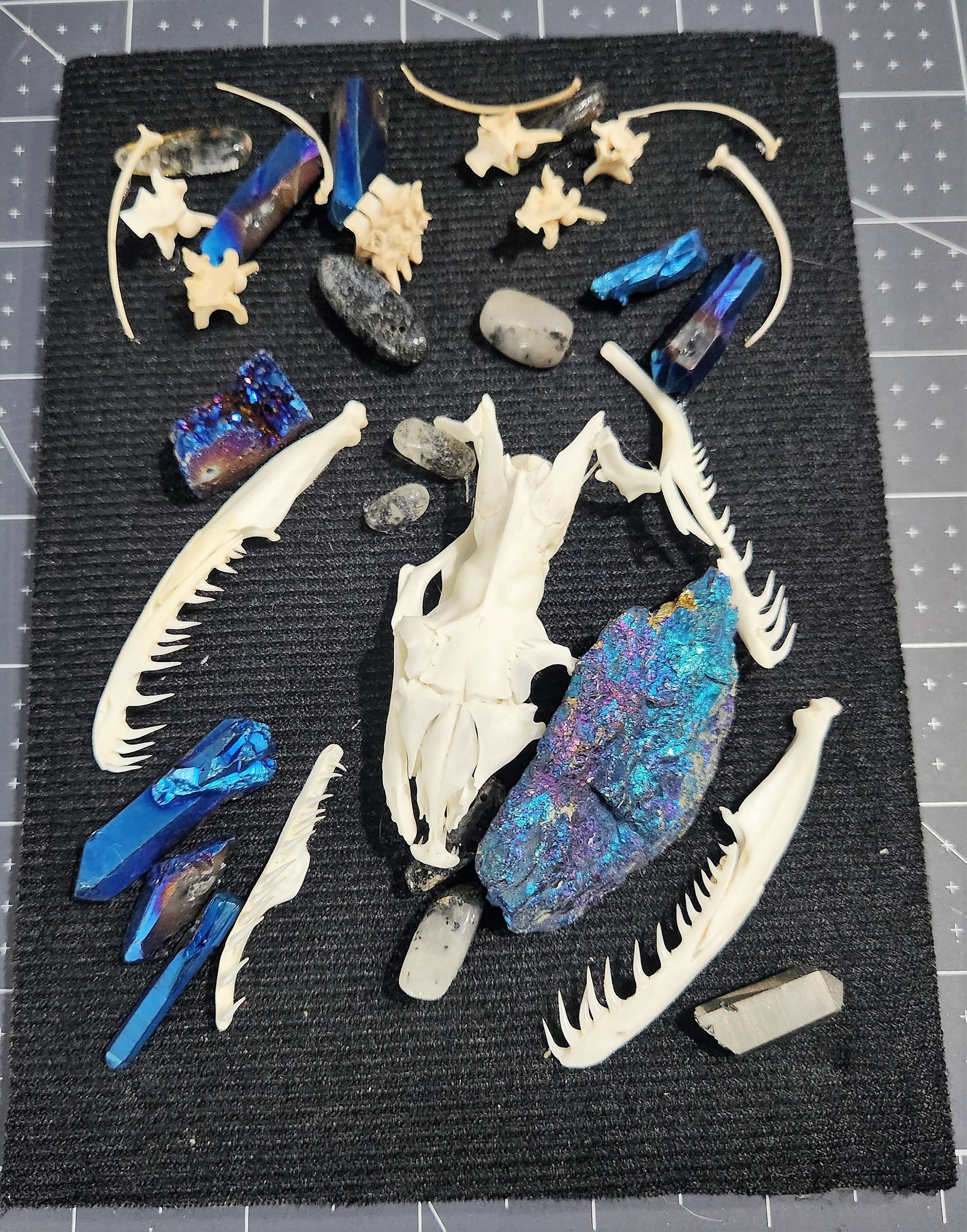 Blue Chalcopyrite and quartz stones surround the python skull, as well as smaller snake vertebrae and rib bones. The shadowbox can either sit flat or be hung, but I would recommend being shown flat to help reduce the likelihood of stones shifting. The shadowbox measures 7"x7".