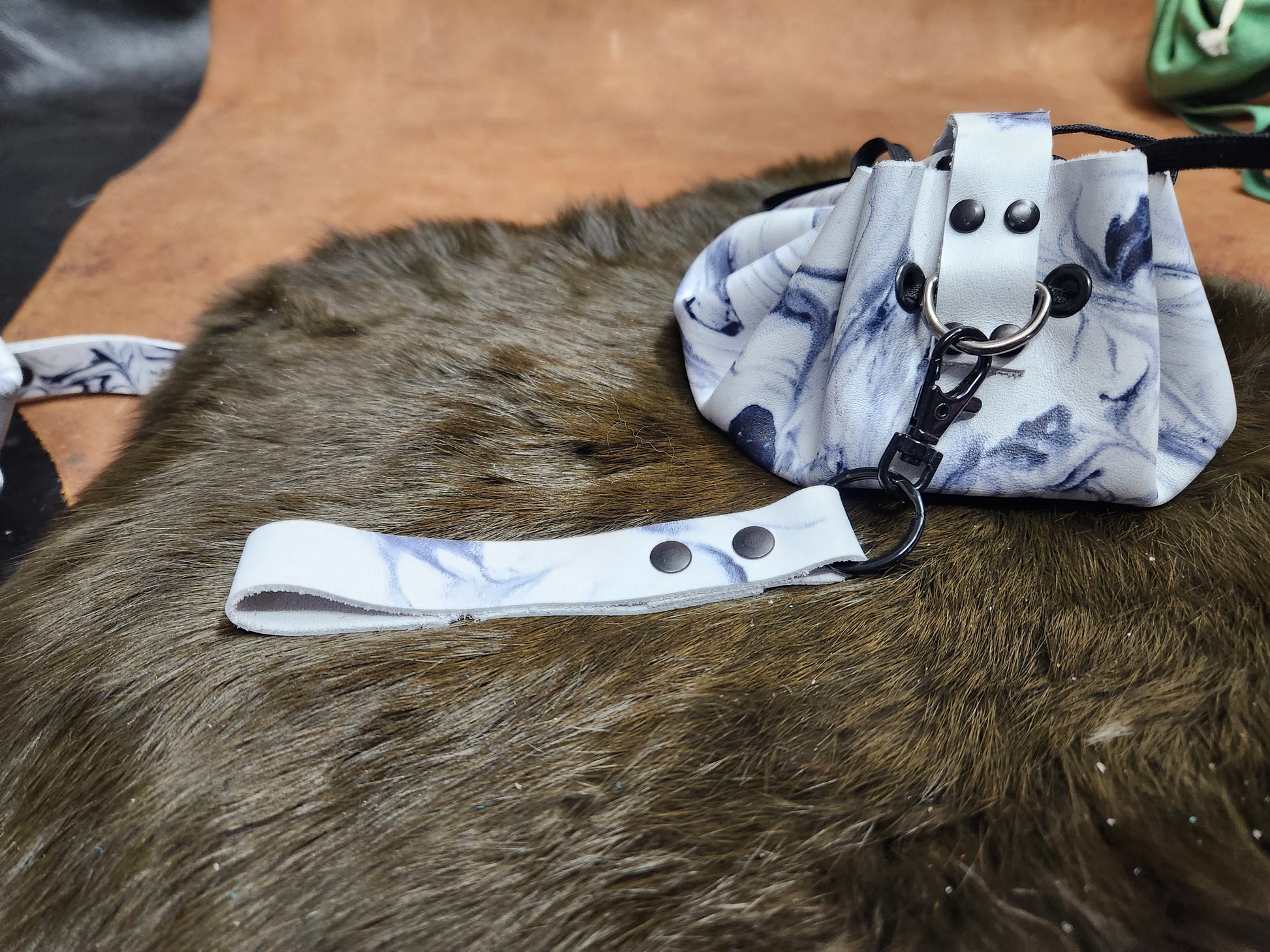 This fun leather drawstring pouch is made to open completely for a flat rolling surface and is great for gamers on the go. A D ring on the back is attached to a keyring and loop that can accommodate up to a 2" belt. This bag can also be opened for a flat rolling surface, perfect for your game night! Use for special occasions, costume pieces, or just to store runes or trinkets that have special meaning to you.