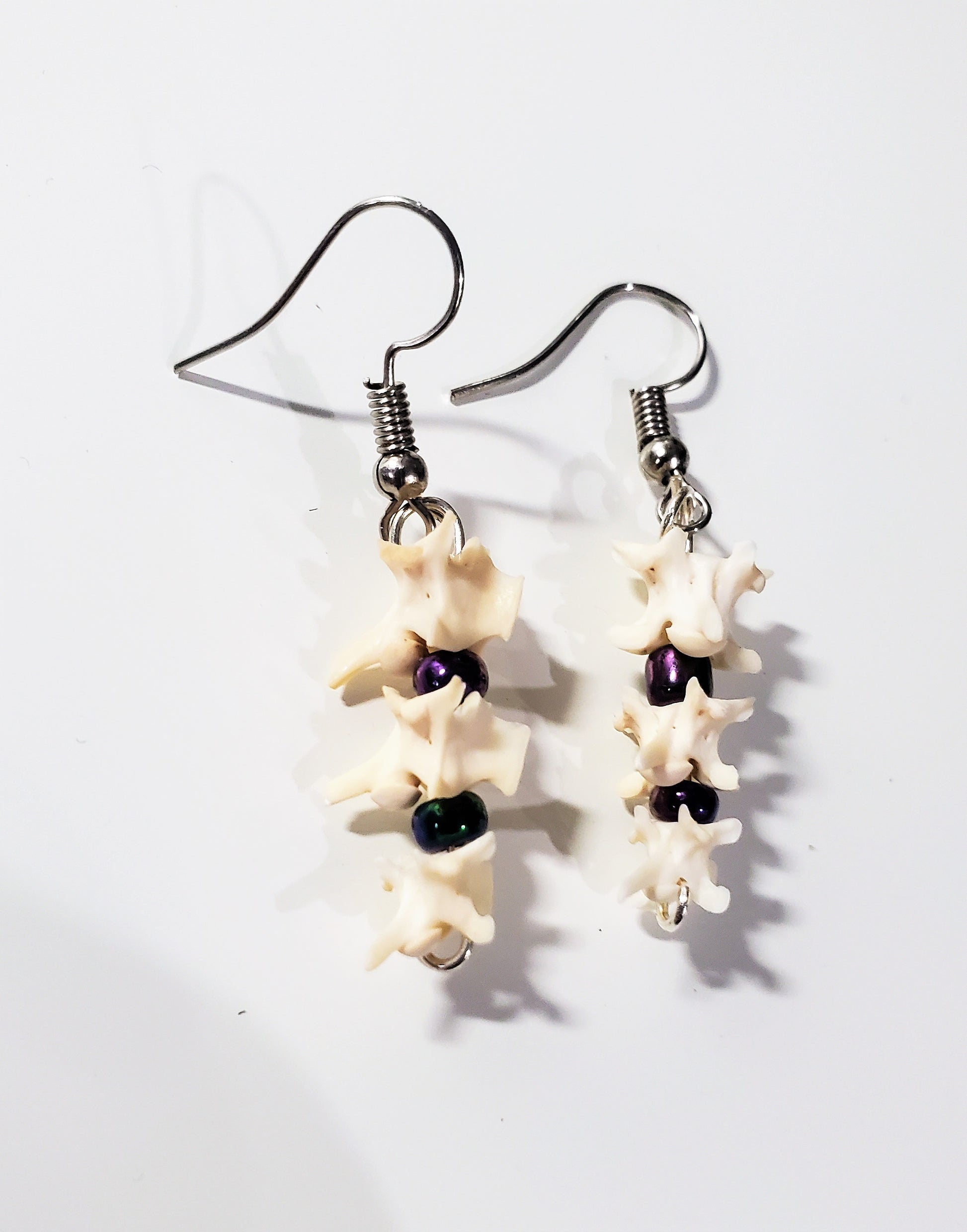 These spooky earrings are made from real rattlesnake vertebrae bones, and either real hematite stone or iridescent rainbow glass beads. Bones may have a natural patina. Hand set and finished, each piece is unique and perfect for your next spooky event, or just a conversation piece for daily wear. As these are real bones, they are small and delicate, so store and handle with care! Earrings are finished on a hypoallergenic ear wire.