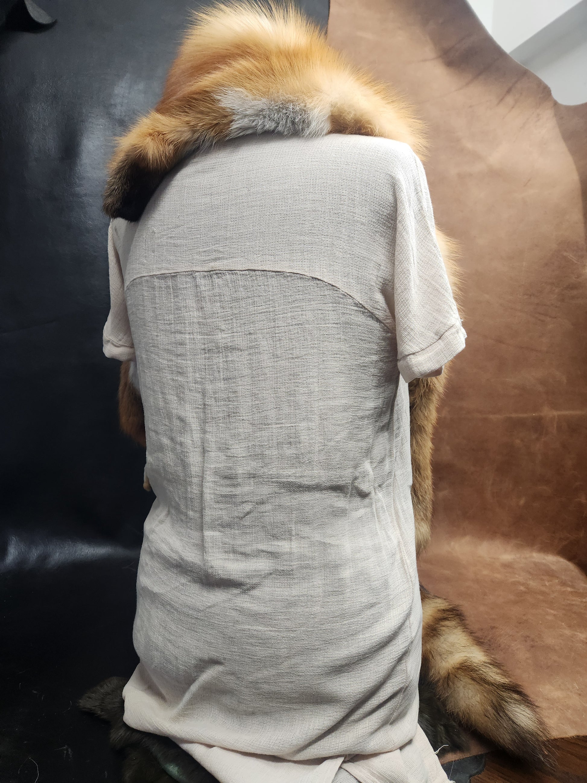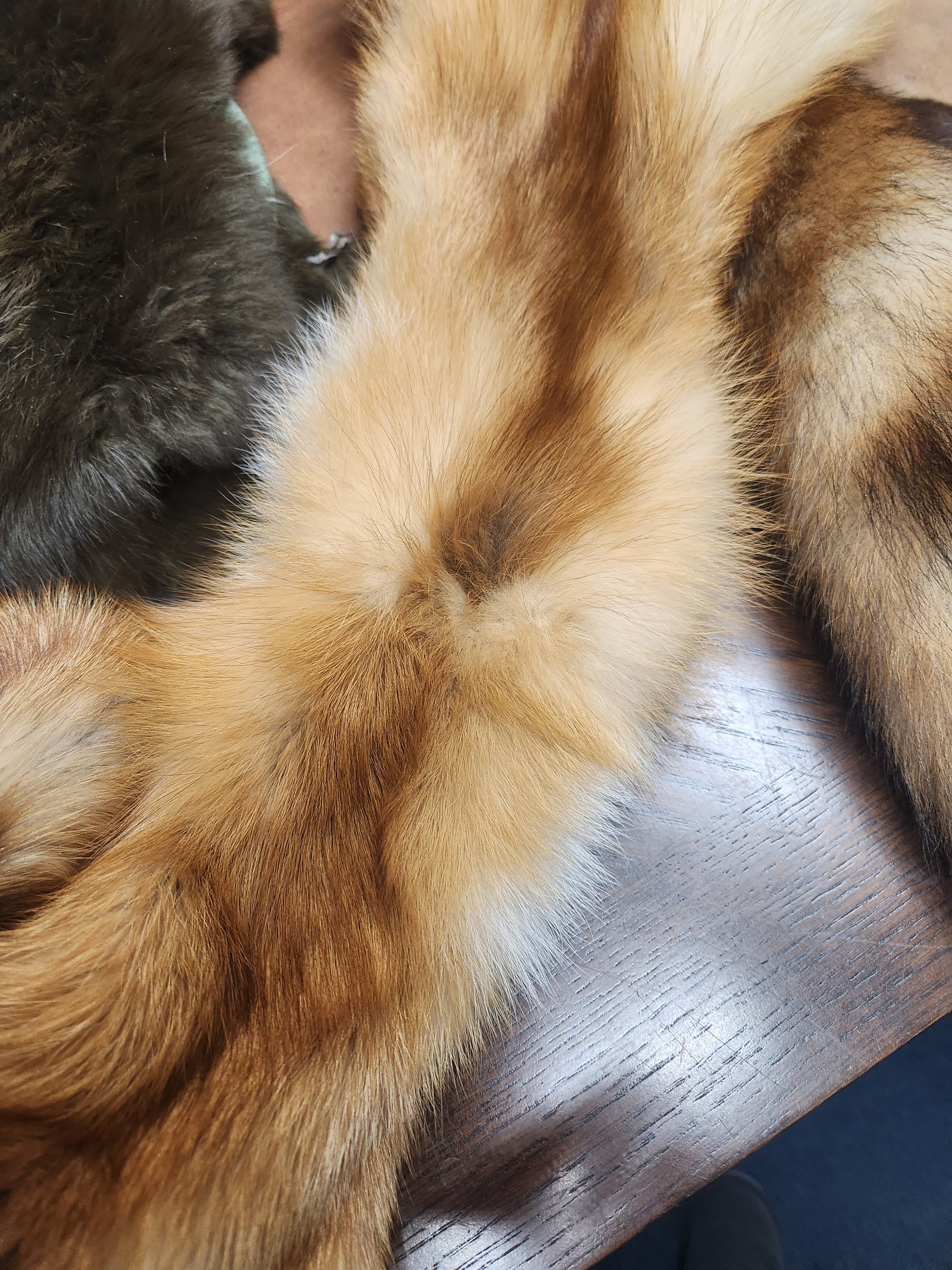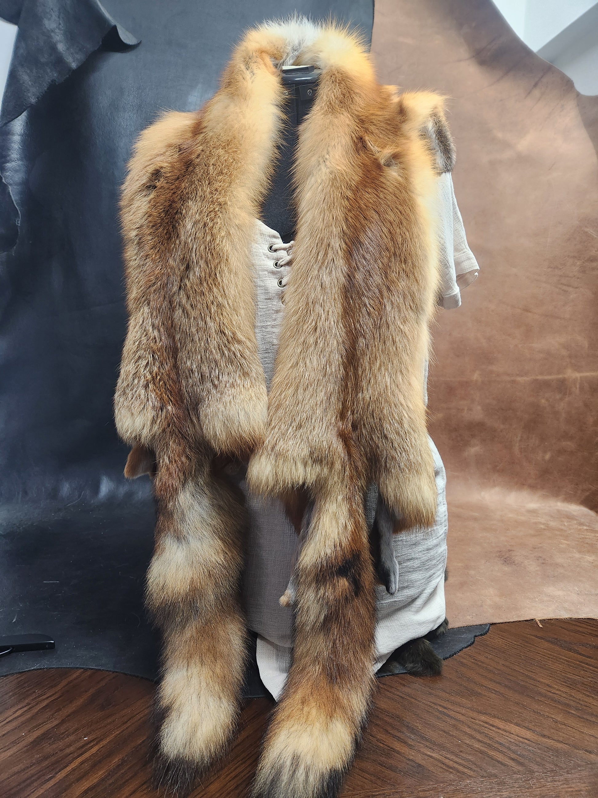 This beautiful stole is made from two whole red fox pelts. We removed the faces, and then stitched them together at the neck to make a singular, soft drape ready to go on your next adventure.