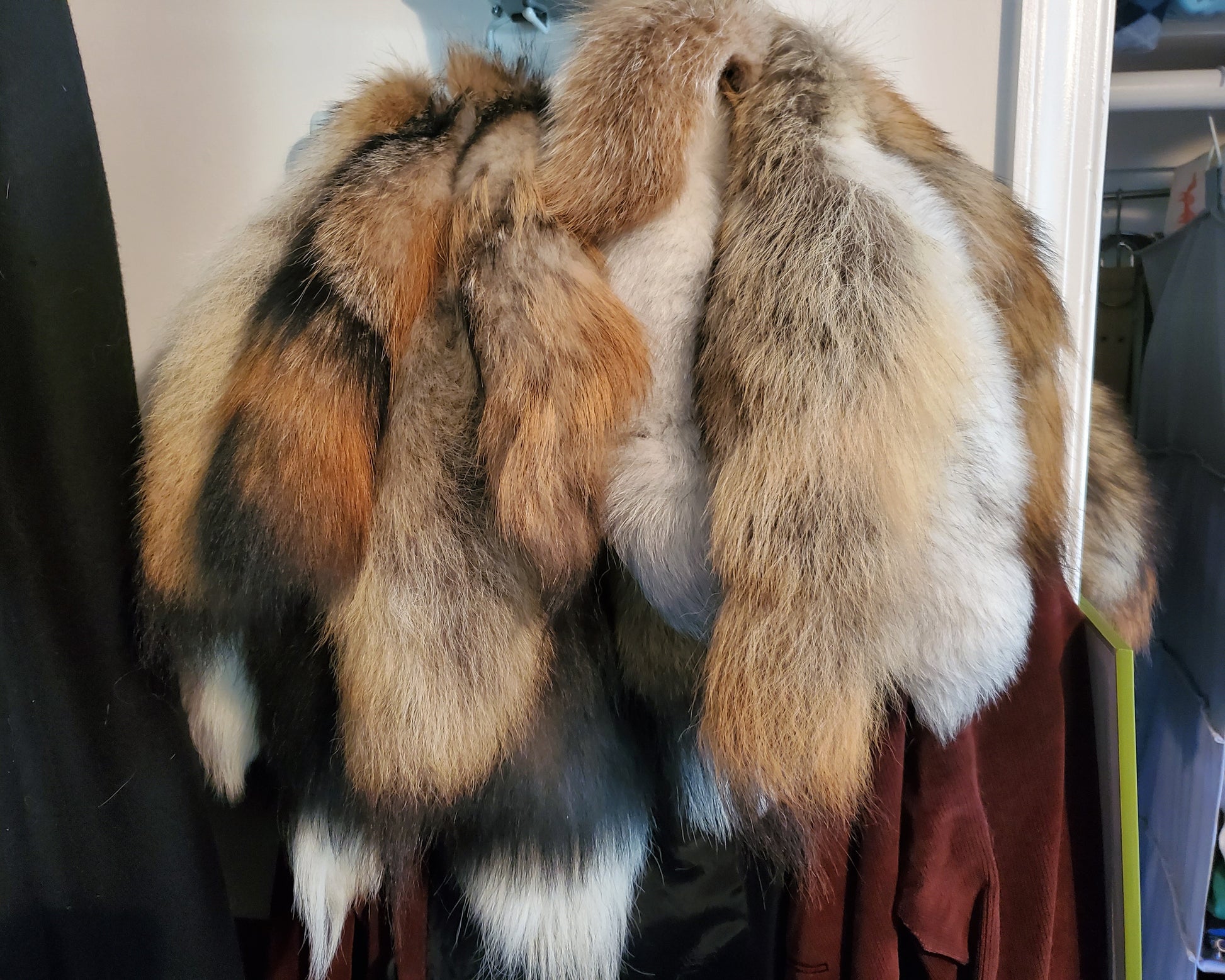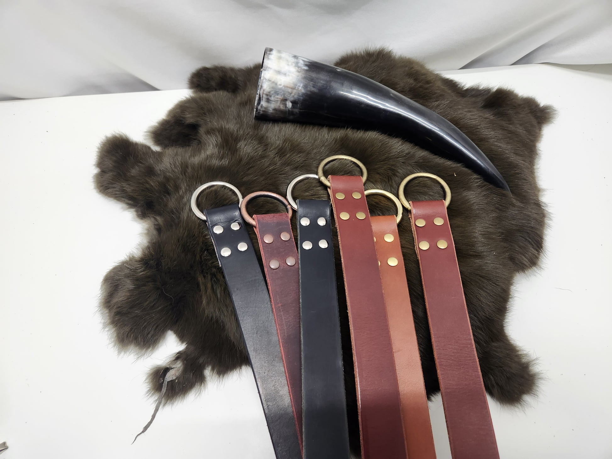 Male bags may contain any variety of the following: Drawstring belt bags, face bags, medium or large bracers, ring belts, drinking horns, mug frogs, small pouches, leather cuffs, tail keychains