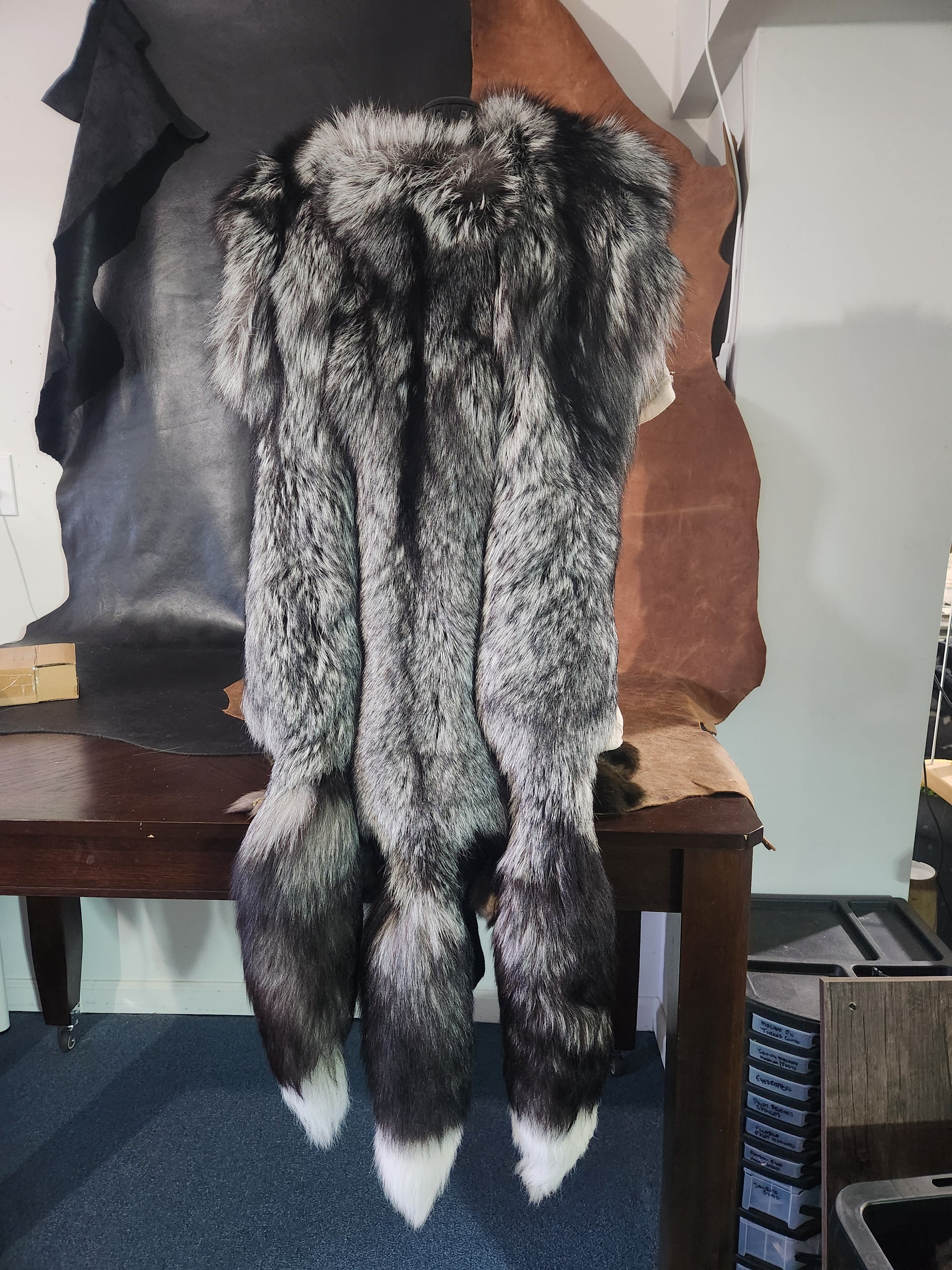 Triple Silver Fox Pelt Fur Mantle with Black Deerskin
