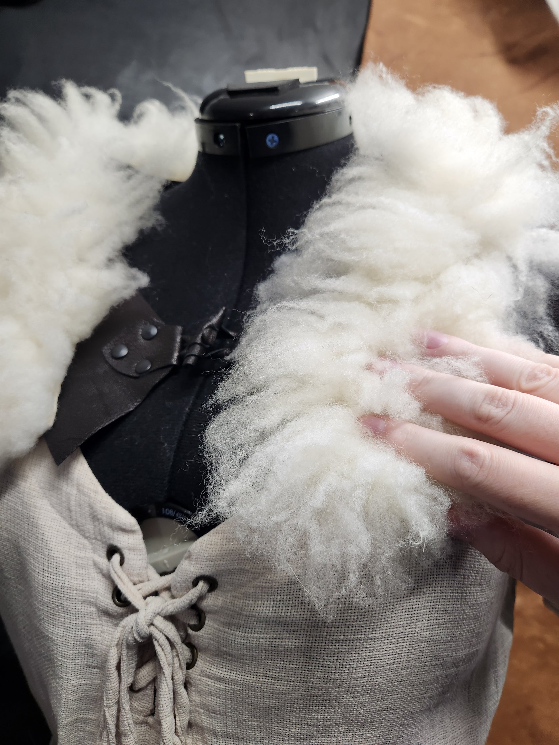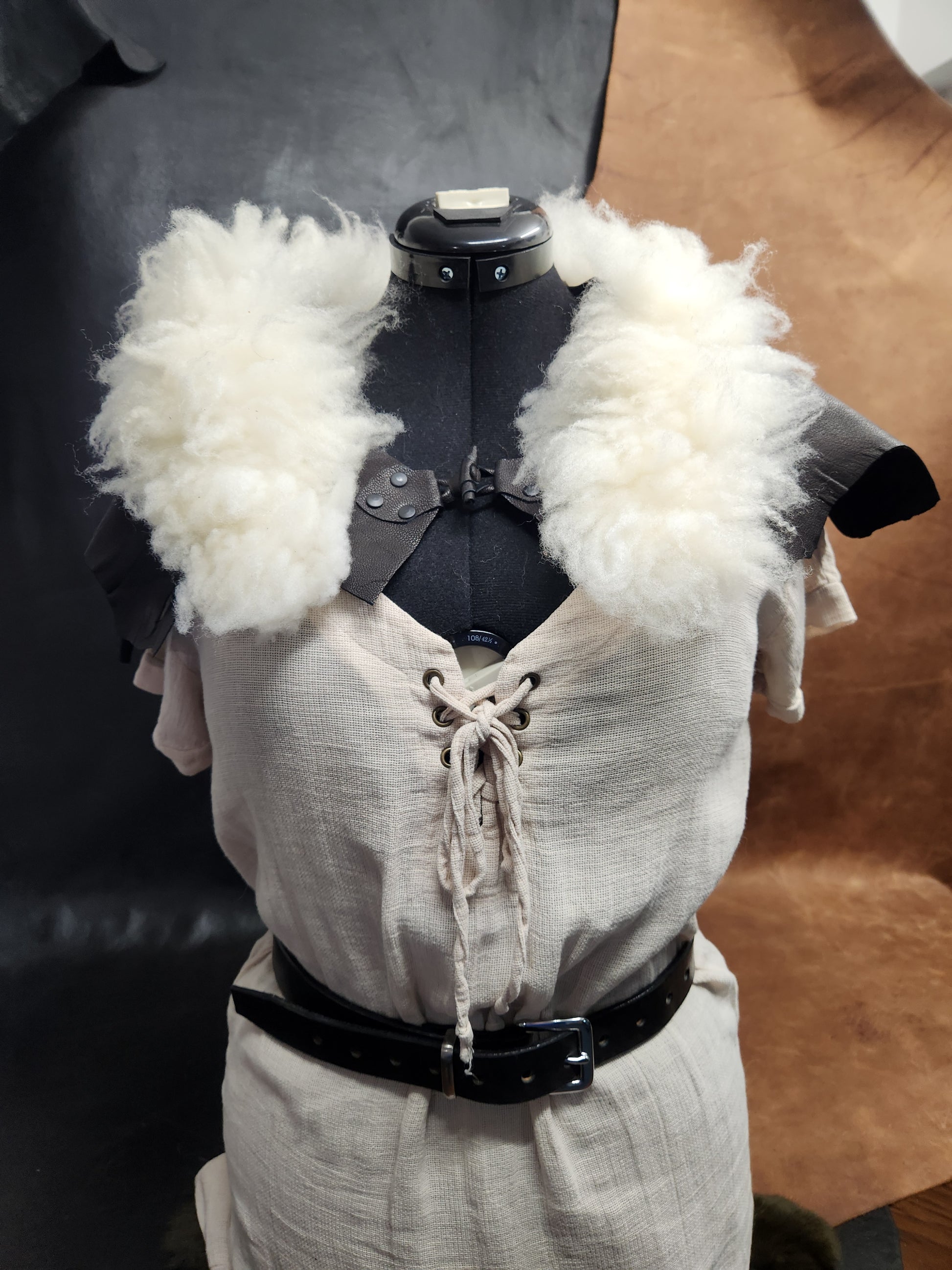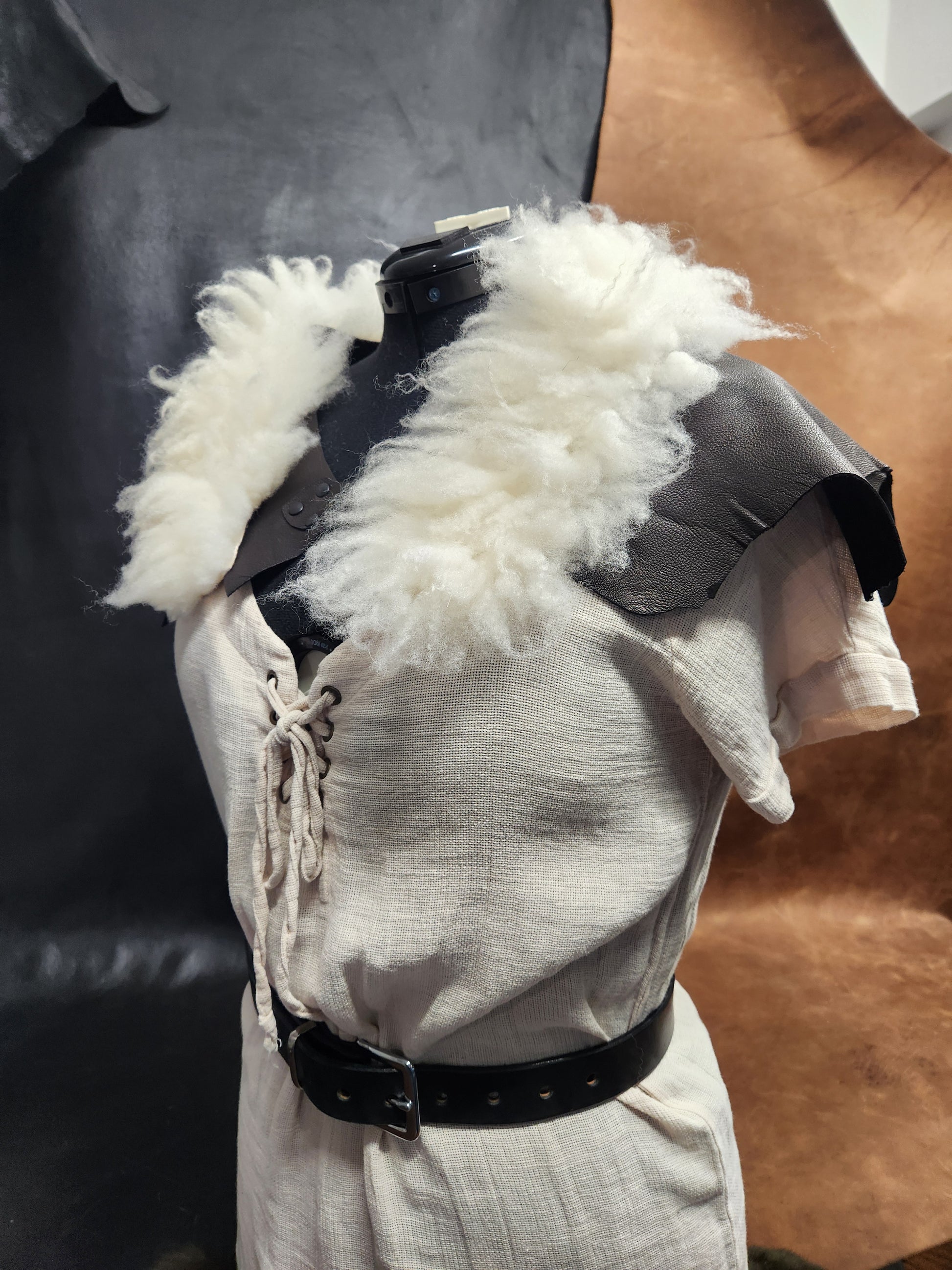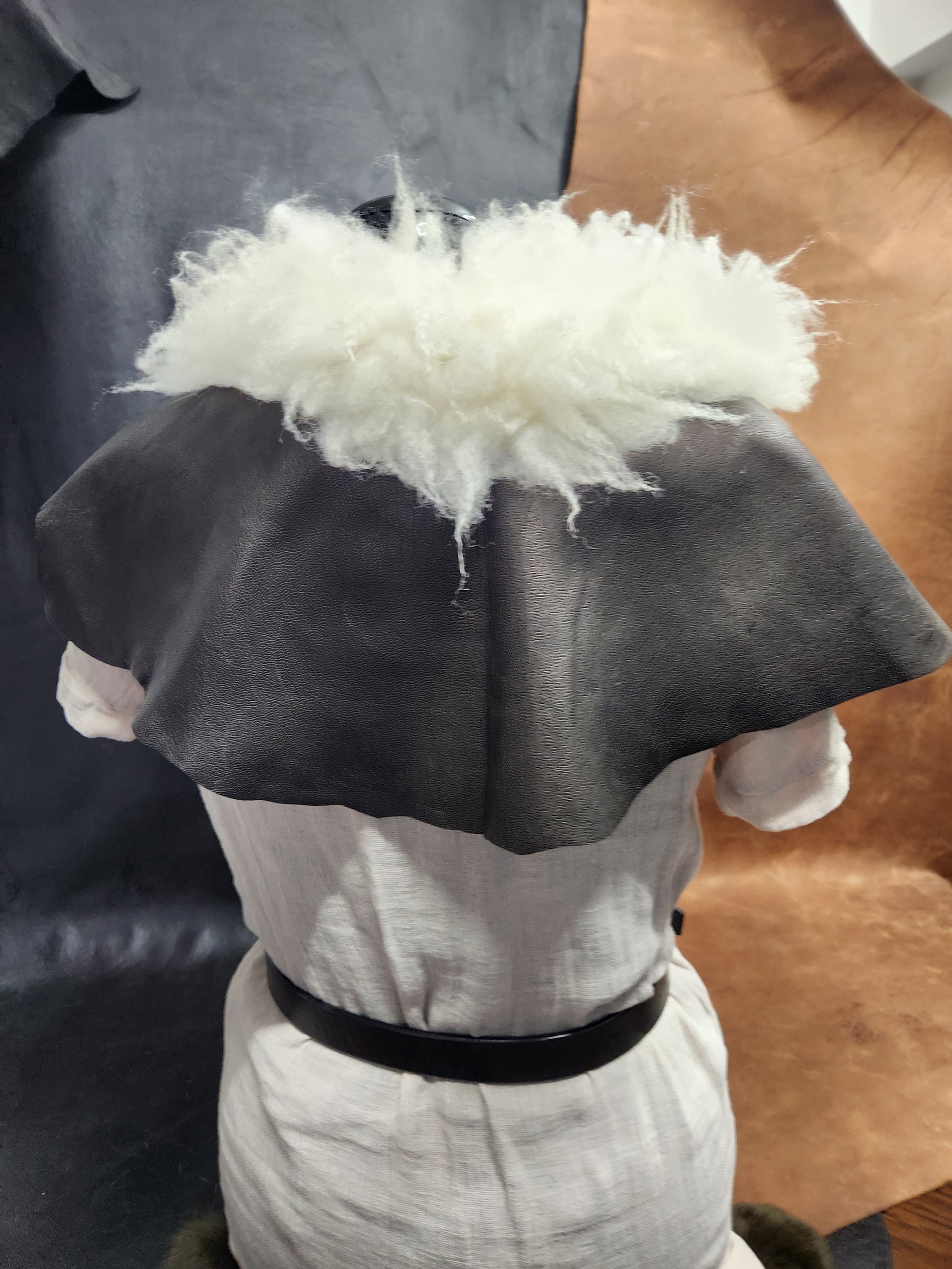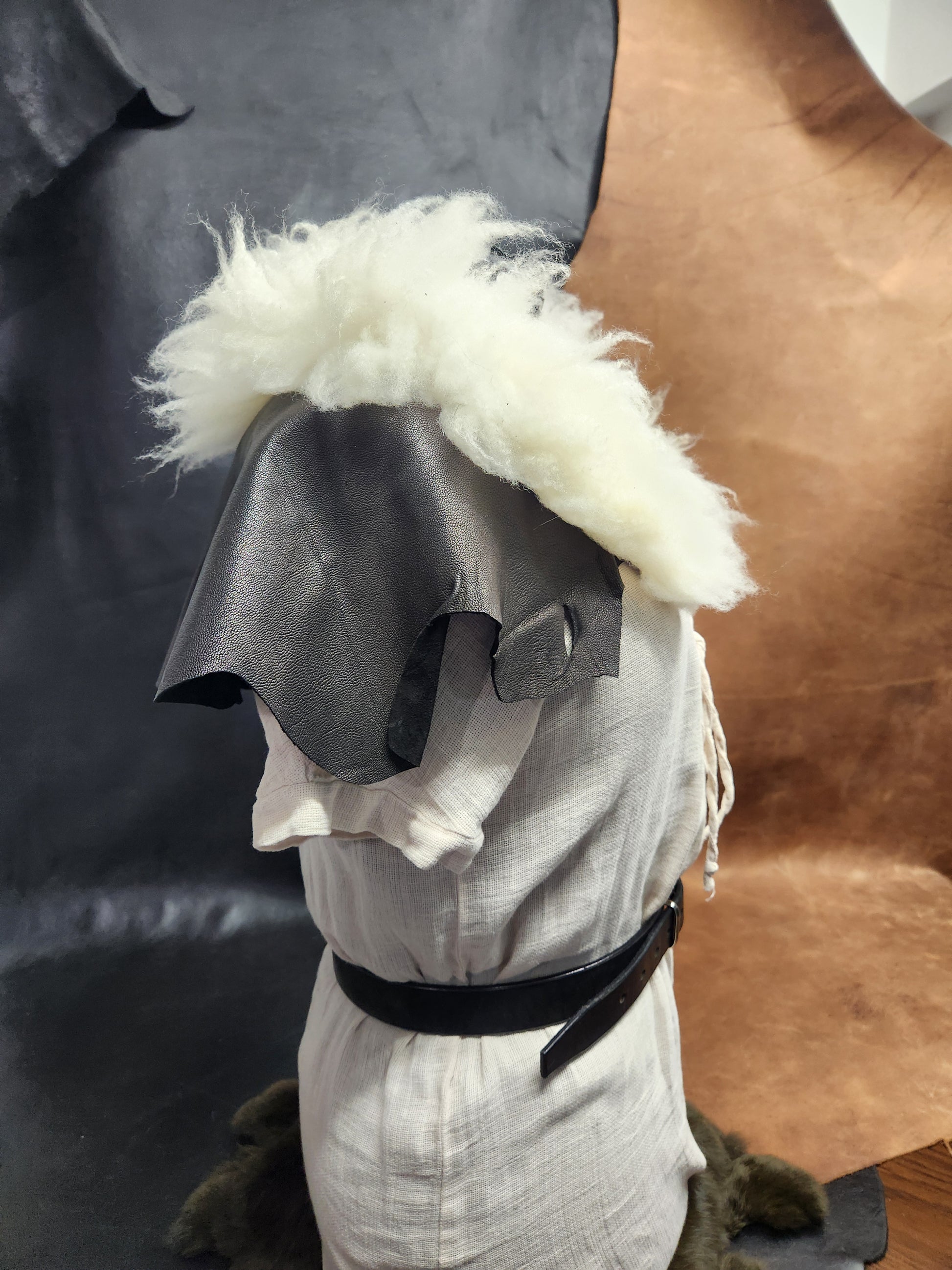 This soft and fluffy cape is made from a thin strip of local Maryland sheepskin, set on a soft black deerskin. It is finished with a wooden toggle. Perfect accessory for your viking gear, it is simple and warm and ready for your next adventure. One size fits most.